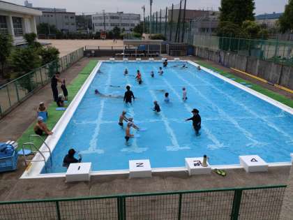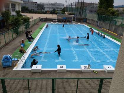 7/21〜29の間、5、6年生を対象に水泳特別練習を実施しています。2種目(クロール・平泳ぎ)25メートル以上、泳ぐことを目標にがんばっています。