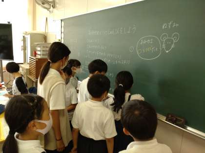 5時間目に、縦割り班で、今週の土曜授業で行うお店めぐりの準備をしました。