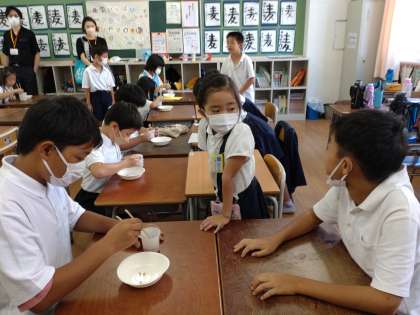 児童会の取り組みであるお店めぐり「力をあわせて 笑顔で楽しく」