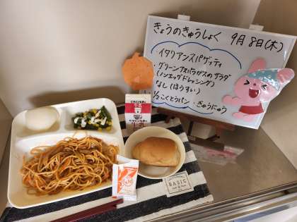 今日の給食は、イタリアンスパゲッティ、グリーンアスパラガスのサラダ[ノンエッグドレッシング]、なし(豊水)、1/2黒糖パン、牛乳です。
