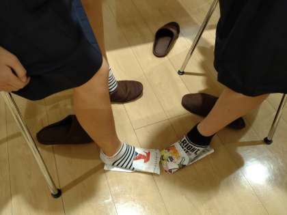 チラシを使って、紙のスリッパの折り方を教えていただきました。