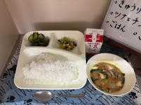 今日の給食は、ウインナーのケチャップソース、スープ、焼きかぼちゃ、黒糖パン、牛乳です。