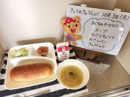 今日の給食は、まぐろのオーロラ煮、スープ、あっさりキャベツ、おさつパン、牛乳です。
