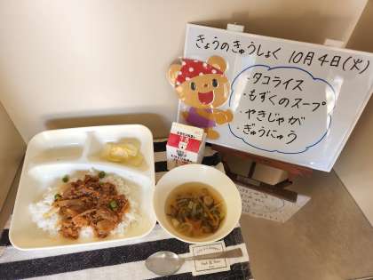 今日の給食は、タコライス、もずくのスープ、焼きじゃが、牛乳です。