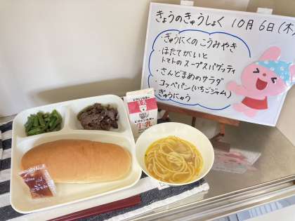 今日の給食は、牛肉の香味焼き、ほたて貝とトマトのスープスパゲッティ、さんどまめのサラダ、コッペパン(いちごジャム)、牛乳です。