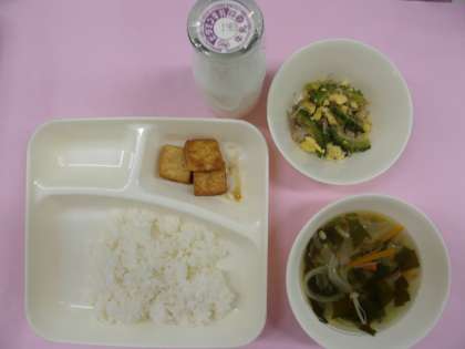 今日の献立は「ゴーヤチャンプルー、五目汁、あつあげのしょうがじょうゆかけ」でした。