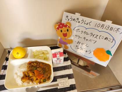 今日の給食は、ポークカレーライス[米粉]、サワーキャベツ、みかん、牛乳です。