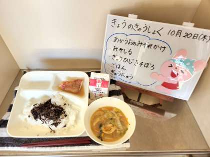 今日の給食は、あかうおのみぞれかけ、みそ汁、牛ひじきそぼろ、ごはん、牛乳です。