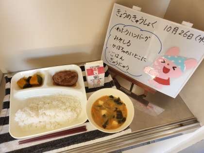 今日の給食は、和風ハンバーグ、みそ汁、かぼちゃのいとこ煮、ごはん、牛乳です。