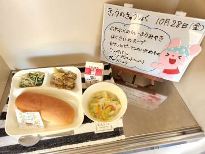 今日の給食は、豚肉のカレー風味焼き、はくさいのスープ、もやしとピーマンのいためもの、コッペパン(アプリコットジャム)、牛乳です。