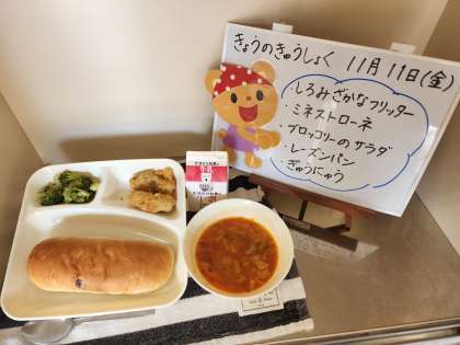 今日の給食は、白身魚フリッター、ミネストローネ、ブロッコリーのサラダ、レーズンパン、牛乳です。