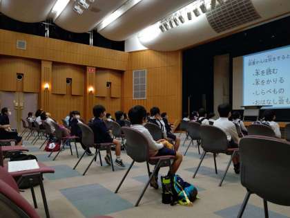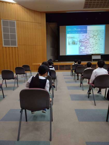 中央図書館では、前半、後半に別れて見学をします。前半グループが到着してお話を聞いています。