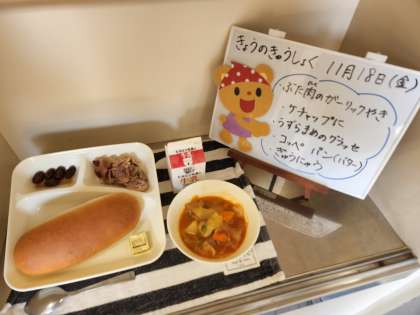 今日の給食は、豚肉のガーリック焼き、ケチャップ煮、うずら豆のグラッセ、コッペパン(バター)、牛乳です。