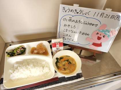 今日の給食は、鶏肉のおろしじょうゆかけ、みそ汁、こまつなのいためもの、ごはん、牛乳です。