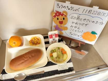 今日の給食は、豚肉と野菜のスープ煮、変わりピザ、みかん、黒糖パン、牛乳です。