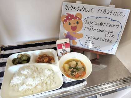 今日の給食は、あげどりのねぎだれかけ、豚肉とじゃがいもの煮もの、キュウリの赤じそあえ、ごはん、牛乳です。