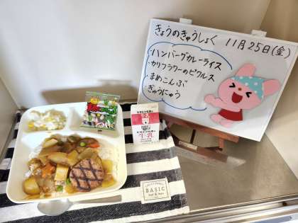 今日の給食は、ハンバーグカレーライス、カリフラワーのピクルス、豆こんぶ、牛乳です。