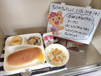 今日の給食は、ほうれんそうのグラタン、スープ煮、白桃(缶詰)、コッペパン(マーマレード)、牛乳です。