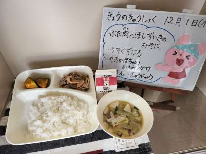 今日の給食は、豚肉と干しずいきのみそ煮、うすくず汁、焼きかぼちゃの甘みつかけ、ごはん、牛乳です。