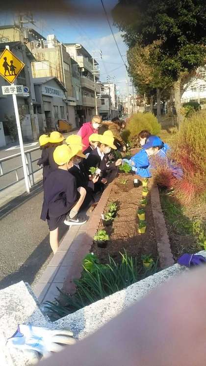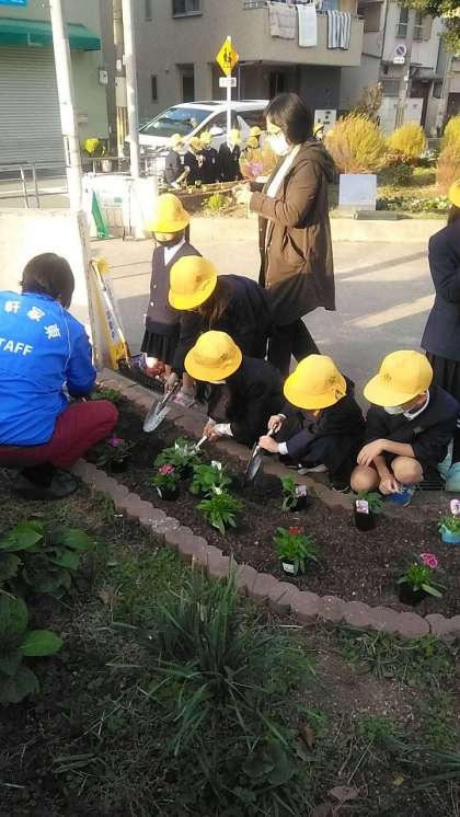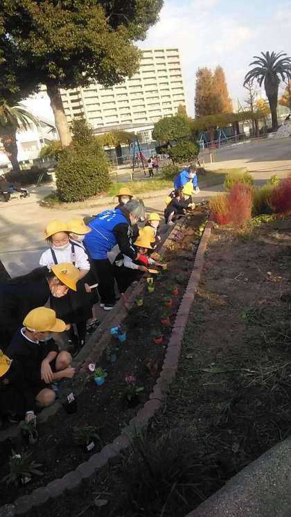いきいきの子ども達が、地域の方々と一緒に三軒家公園の花壇に花の苗を植えました。