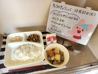 今日の給食は、鶏肉と野菜の煮もの、ひじき豆、かぶのゆず風味、ごはん、牛乳です。