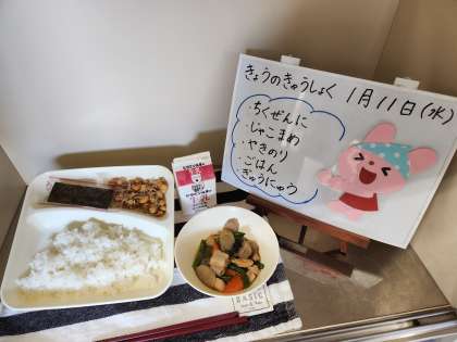 今日の給食は、筑前煮、じゃこ豆、焼きのり、ごはん、牛乳です。