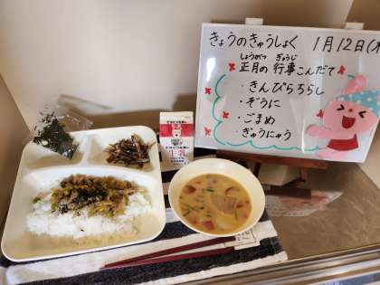 今日の給食は、正月の行事献立です。きんぴらちらし、ぞう煮、ごまめ、牛乳です。