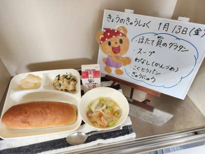 今日の給食は、ほたて貝のグラタン、スープ、和なし(缶詰)、黒糖パン、牛乳です。