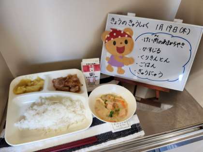 今日の給食は、鶏肉の甘辛焼き、かす汁、くりきんとん、ごはん、牛乳です。