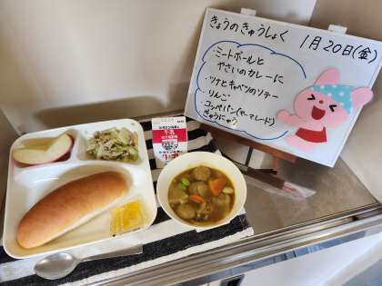 今日の給食は、ミートボールと野菜のカレー煮、ツナとキャベツのソテー、りんご、コッペパン(マーマレード)、牛乳です。
