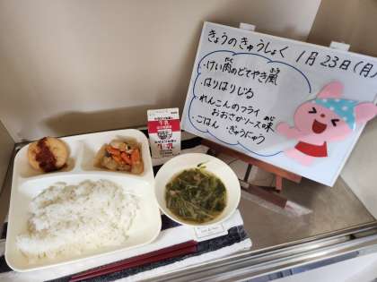 今日の給食は、鶏肉の土手焼き風、はりはり汁、れんこんのフライ大阪ソース味、ごはん、牛乳です。