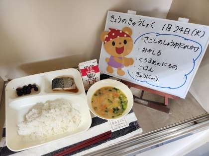 今日の給食は、さごしのしょうゆだれかけ、みそ汁、黒豆の煮もの、ごはん、牛乳です。