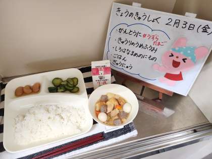 今日の給食は、関東煮、きゅうりの梅風味、白花豆の煮もの、ごはん、牛乳です。