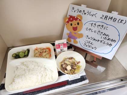 今日の給食は、すき焼き煮、もやしとささみのいためもの、きゅうりのゆず風味、ごはん、牛乳です。