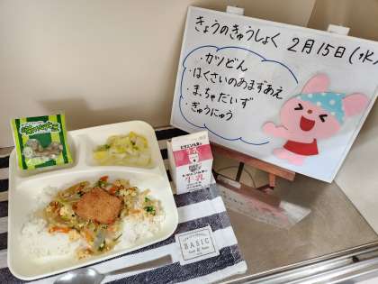今日の給食は、カツ丼、はくさいの甘酢あえ、まっ茶大豆、牛乳です