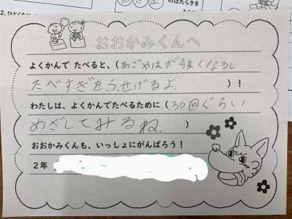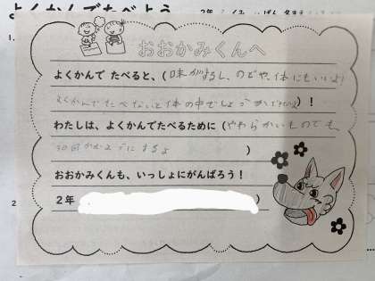 子ども達は、「よくかんで食べよう」という学習をしました。学習したことを、おおかみくんに教えてあげました。
