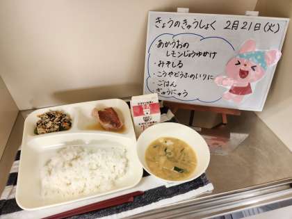 今日の給食は、あかうおのレモンじょうゆかけ、みそ汁、高野どうふのいり煮、ごはん、牛乳です。