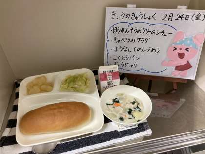 今日の給食は、ほうれんそうのクリームシチュー、キャベツのサラダ、洋なし(缶詰)、黒糖パン、牛乳です。