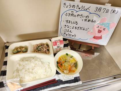 今日の給食は、豚肉と野菜のいためもの、すまし汁、きな粉よもぎだんご、ごはん、牛乳です。