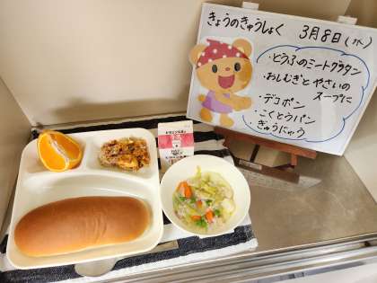 今日の給食は、とうふのミートグラタン、押麦と野菜のスープ煮、デコポン、黒糖パン、牛乳です。