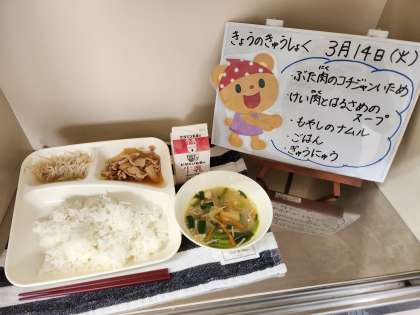 今日の給食は、豚肉のコチジャンいため、鶏肉とはるさめのスープ、もやしのナムル、ごはん、牛乳です。