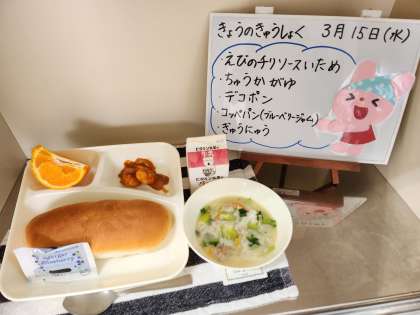 今日の給食は、えびのチリソースいため、中華がゆ、デコポン、コッペパン(ブルーベリージャム)、牛乳です。