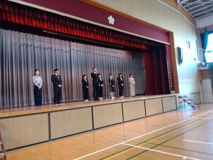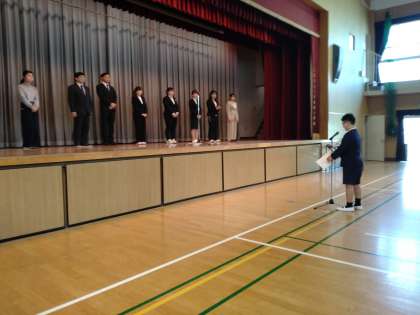 教職員が一人ずつ自己紹介をした後、6年生の代表児童が、歓迎のあいさつをしました。