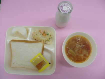 今日の献立は「えびグラタン、トマトスープ、なし(豊水)」でした。