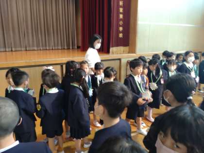 2年生から、朝顔の種入のペンダントをプレゼントしてもらい、嬉しそうでした。