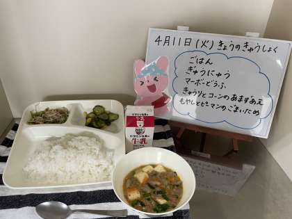 今日の給食は、ごはん、牛乳、マーボーどうふ、きゅうりとコーンの甘酢あえ、もやしとピーマンのごまいためです。