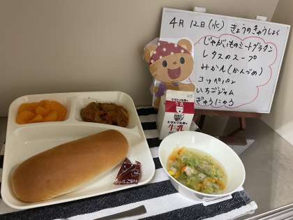 今日の給食は、コッペパン、牛乳、じゃがいものミートグラタン、レタスのスープ、みかん(かんづめ)、いちごジャムです。