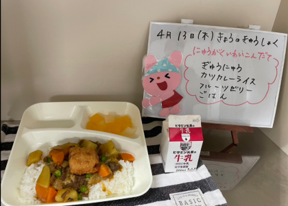 今日の給食は入学お祝いこんだてのカツカレーライス、牛乳、フルーツゼリーです。