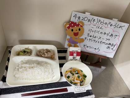 今日の給食は、ごはん、牛乳、鶏肉のからあげ、中華スープ、チンゲンサイともやしの甘酢あえです。