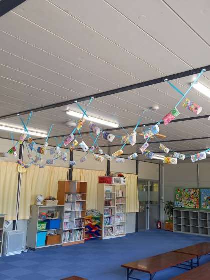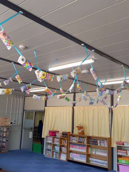 みんながぬり絵をしたこいのぼりが活動室で泳いでいます。